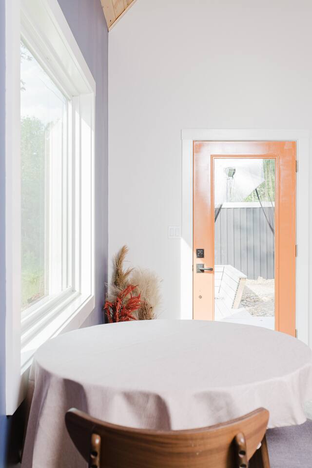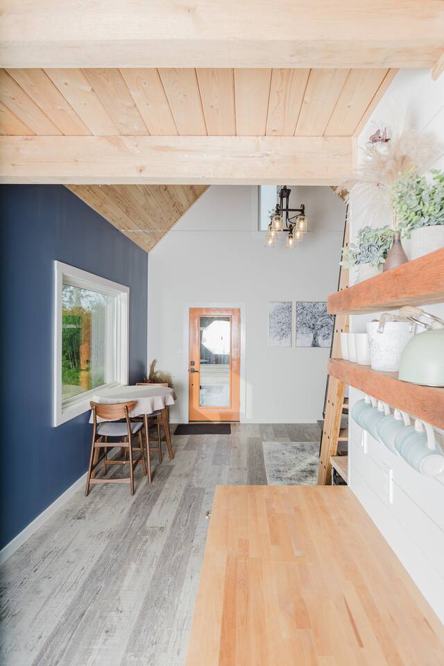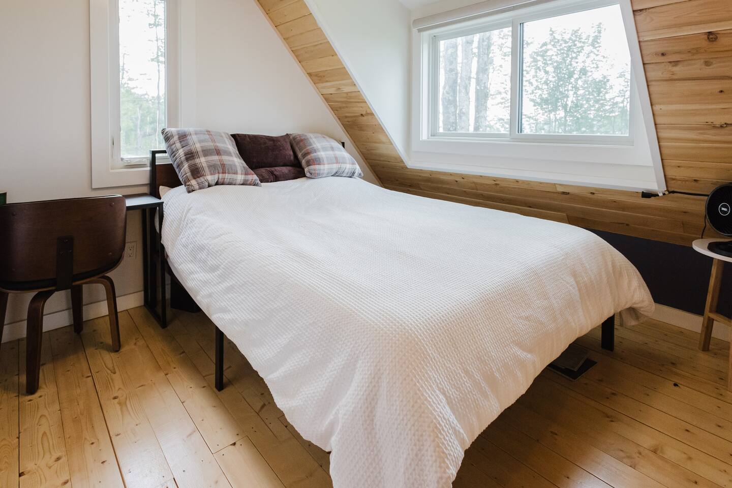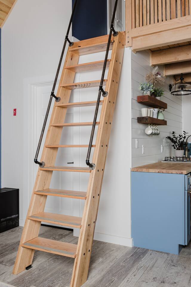 The bed is in the loft, which is accessible by a ship's ladder. While most able-bodied adults will find this to be no problem, furry friends and small children will not be able to traverse the ladder safely. A baby gate is available for those who need it.