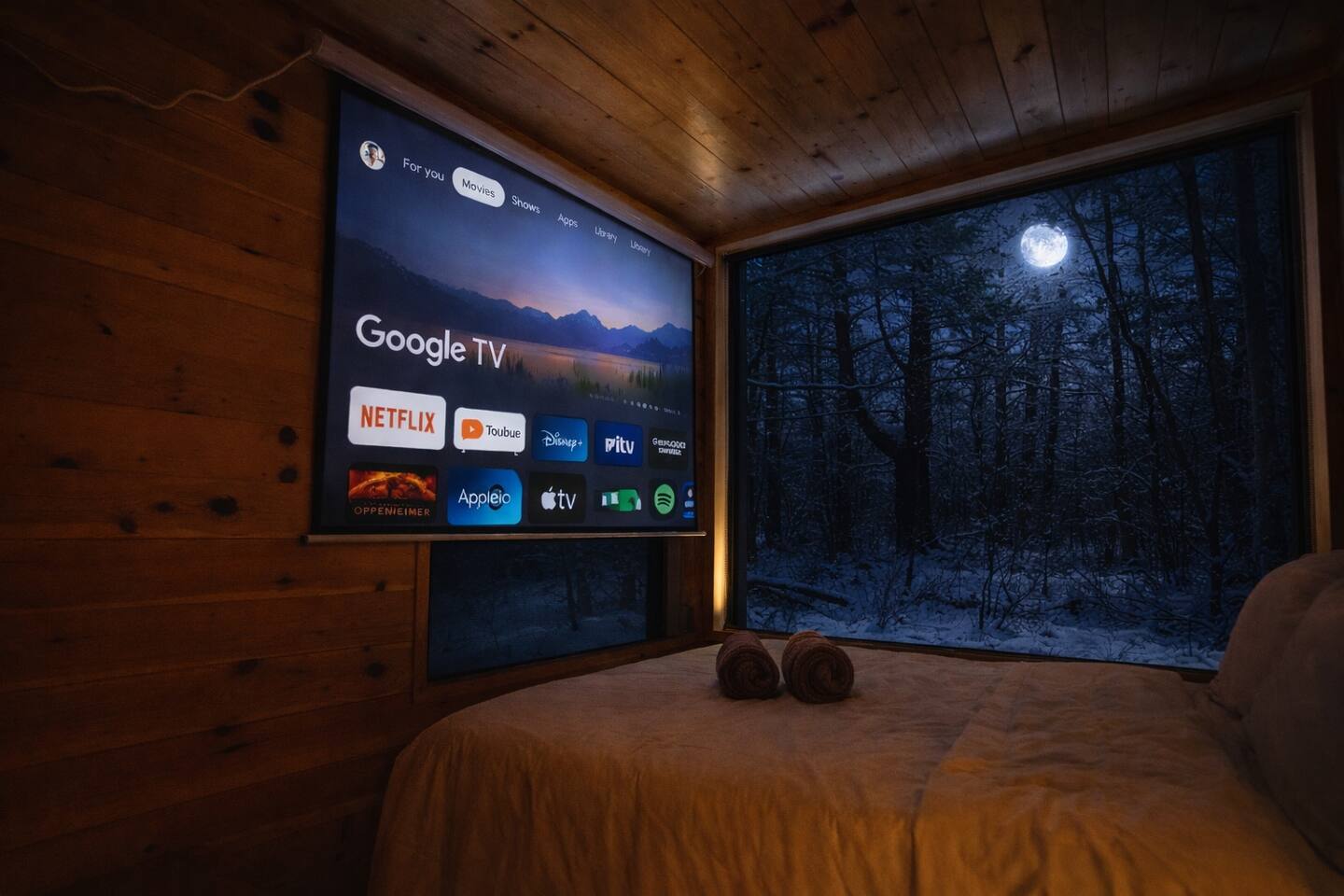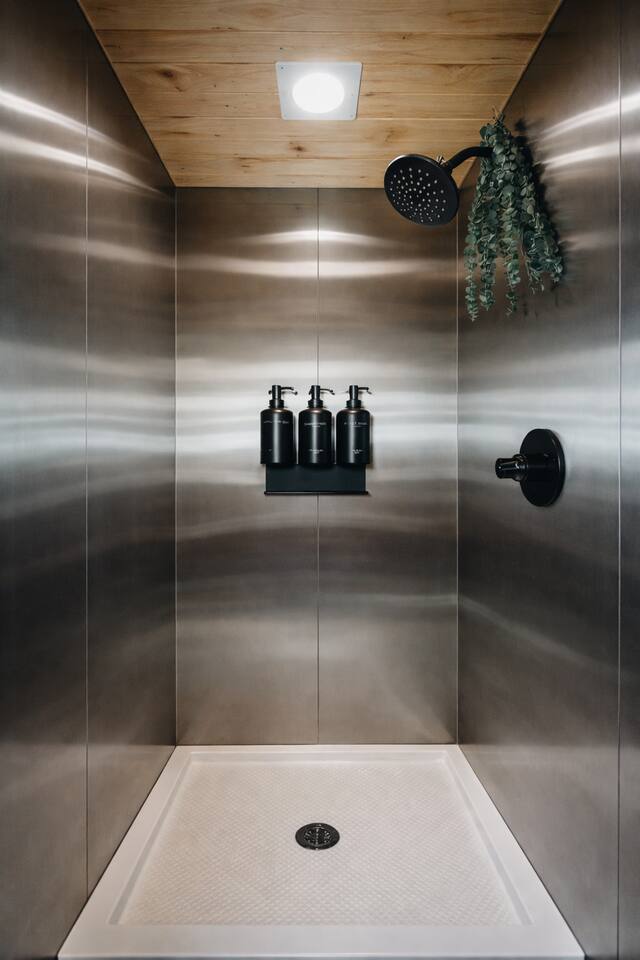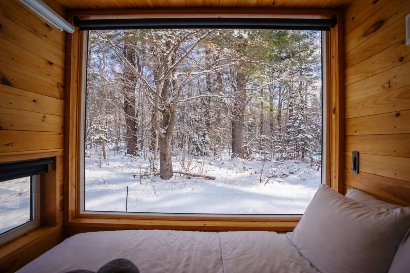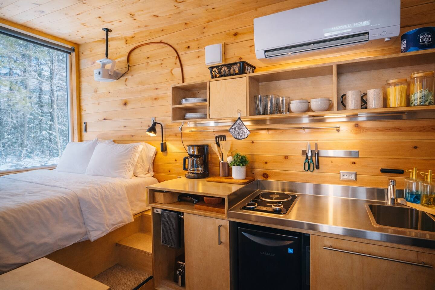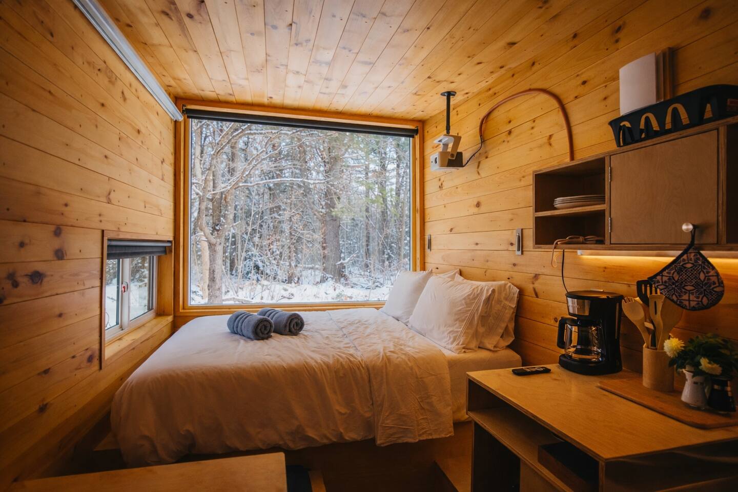 Enjoy Timberlight Retreat, a tiny home with a queen bed, fully equipped kitchen, spa-style shower, and built-in projector with Google TV. Look out from your large picture window with forest views. Relax in your private outdoor hot tub, unwind in the quiet woods, and take advantage of easy access to trails, lakes, and local dining. Ideal for couples, weekend getaways, or a nature escape.